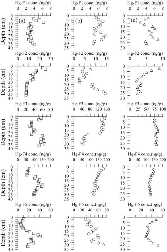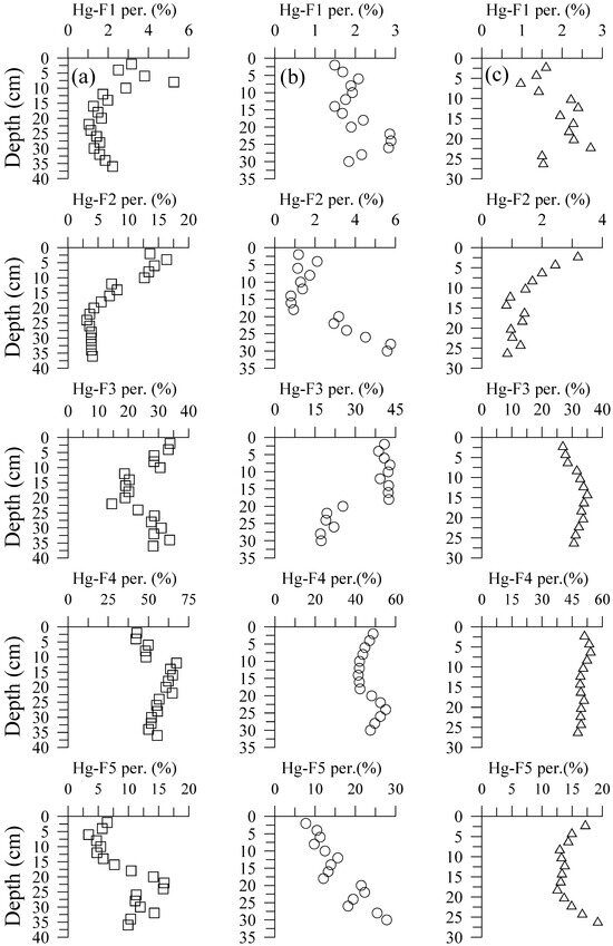 Figure 5 shows that the profile of different fractions of Hg concentration in the different sediment cores exhibited inconsistency. The F2 fraction in sediment cores of the upper estuary showed a concentration decrease with increasing depth, while the other three fractions generally exhibited the maximum concentration occurring at depths of 15–25 cm. The F2 and F5 fractions in sediment cores of the middle estuary indicated concentration increase with increasing depth, while the F3 and F4 fractions exhibited concentration decreases with increasing depth. The F2 and F4 fractions in sediment cores of the lower estuary also exhibited concentration decreases with increasing depth. The concentration of the F3 fraction varied slightly with depth. The F5 fraction showed the minimum concentration appearing at depths of 12–25 cm. These results suggest that the transformations of different Hg fractions significantly occurred during the burial processes in the DRE sediments.