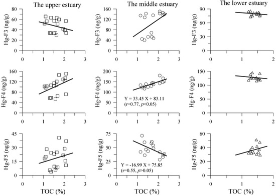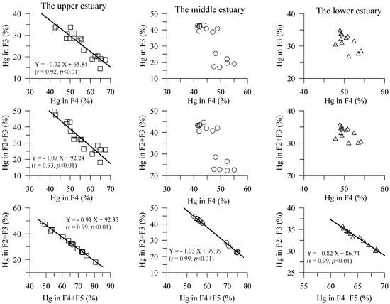 Figure 8 shows that the F4 fraction negatively linearly correlated well with F3 fraction in sediment cores of the upper estuary. The corresponding result was also seen for the sum of the F2 + F3 fractions with the sum of the F4 + F5 fractions of the three sediment cores. The Hg fractions in sediment cores of the middle and the lower estuary also exhibited the same behavior but the correlations were weaker. These results may suggest that the labile Hg (F1 + F2) and the moderately labile fraction Hg (F3) were transformed into the non-labile Hg (F4 and F5) in the three sediment cores of the DRE. These results strongly confirm the transformation of the labile and moderately labile Hg fraction into the non-labile Hg fraction.