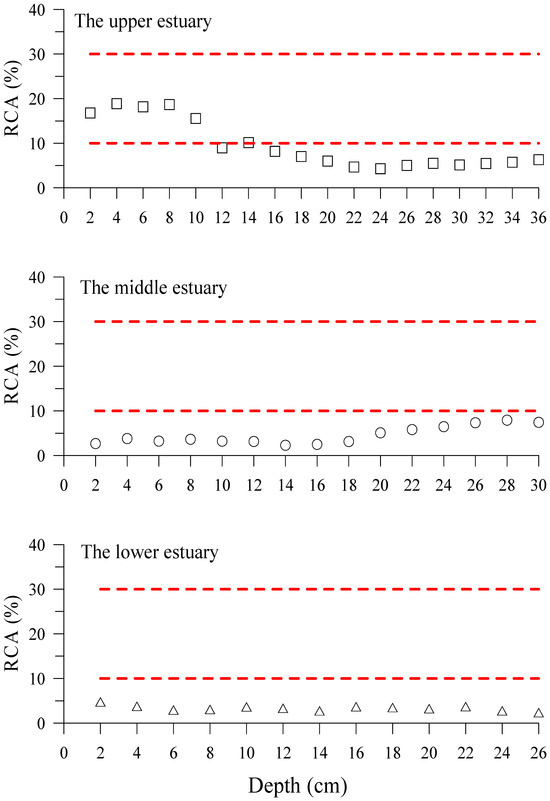 Figure 3 indicates that the total Hg concentrations in sediment cores of the DRE mostly exceeded the ERL value (150 ng/g), but were much lower than the ERM value (710 ng/g) of the sediment quality guidelines, U.S.A. [44]. This result suggests that the sediment cores of the DRE were mildly contaminated by Hg. Meanwhile, Figure 9 indicates that the risk assessment code (RAC) value of the sediment cores in the middle and lower estuary was completely <5%, representing low risk to marine organisms. The similar result was also found deeper (>12 cm) in sediment cores of the upper estuary. Meanwhile, the RAC value of the surface layer depth (2–10 cm) in sediment cores of the upper estuary ranged between 15.5 and 18.9%, representing medium risk to marine organisms. This result implies that Hg still has a potential risk to the benthic organisms in the DRE, which is pioneeringly observed in the DRE.