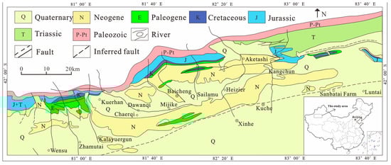 - Yu, H.B.; Qi, J.F.; Yang, X.Z.; Liu, Q.Y.; Cao, S.J.; Fan, S.; Sun, T.; Yang, X.Y. The mesozoic tectonic palaeogeographic analysis in Kuqa depression of Tarim Basin. Geol. J. China Univ. 2016, 22, 657–669. [Google Scholar]