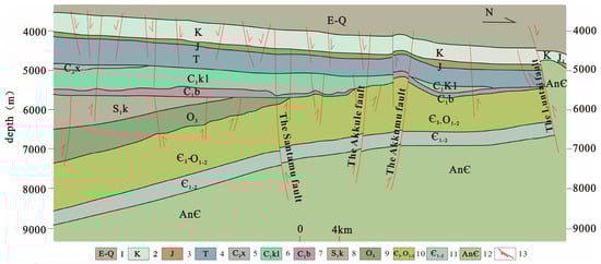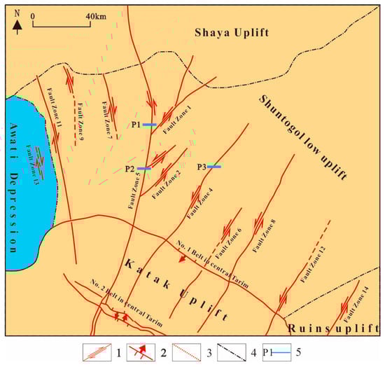 - Tang, L.J.; Qi, L.X.; Xiu, H.J.; Yu, L.; Li, M.; Xie, D.Q.; Yang, Y.; Wan, G.M. Poly-phase differential fault movement and hydrocarbon accumlation of the Tarim Basin, NW China. Acta Petrol. Sin. 2012, 28, 2569–2583. [Google Scholar]