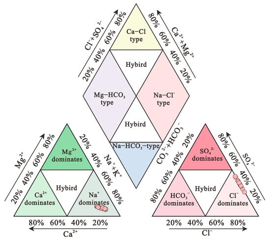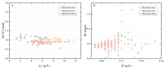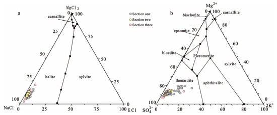 - The hydrochemical characteristic coefficients suggest that the spring water has a high nNa+/nCl− value, low K+ × 103/Cl−, and nK+/nBr− value features. According to the Quaternary system phase diagram and the biquinary system phase diagram, the brine should be rock salt leached and may suggest that the shallow brine underground is still in the initial stage of potash salt sedimentation.