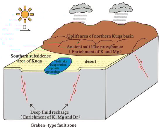 - The residual brine and salt–weathering products of the ancient salt lake undergo a “transferral mineralization” of salts, gathering in the graben–type secondary depression in the southern part of the Shaya region. At the same time, deep fluid rises to recharge the salt lake, and, after further evaporation and concentration, salt deposits are formed.