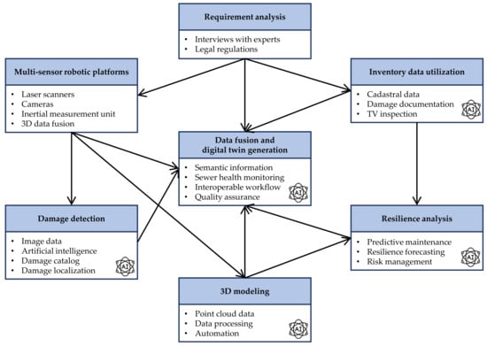 KaSyTwin covers seven interrelated research areas, which are developed in successive, overlapping phases over the duration of the project. An overview of the interdependencies of the research areas is presented in Figure 1. Due to the different sub-objectives of each research area, a multi-method approach is adopted in each project phase. Initially, potential BIM use cases and requirements, which digital twins designed for maintenance purposes should meet, are identified. Next, the hardware of two cooperative multi-sensor robotic platforms for scanning sewer infrastructure is developed. The geometrical information collected by the platforms is used to create a 3D model, which serves as a graphical representation of the digital twin. Further steps aim at processing and integrating semantic data into the digital twin, including the existing inventory data (as-built documentation, cadastral information, and damage documentation) as well as the SHM data collected by the platforms. The final stage of the project covers the development of a resilience analysis and proactive maintenance model, including merging of final components and validation tests. The approaches and methodologies used in the project are described in more detail in the subsections below. Two research fields are described in one subsection if there is a strong connection and dependency between the research fields.
