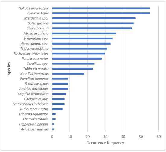 We found three grade-I conservation species (classes): Corallium spp., Tridacna cookiana, and Nautilus pompilius. We found 16 grade II conservation species (classes): A. davidianus, Anguilla marmorata, Hippocampus spp., Eretmochelys imbricata, Chelonia mydas, Cypraea tigris, Cassis cornuta, Strombus gigas, Turbo marmoratus, Charonia tritonis, Tridacna squamosa, Hippopus hippopus, Scleractinia spp., Tubipora musica, Tachypleus tridentatus, and Panulirus ornatus. Moreover, we found seven species (classes) that are listed as local priorities for conservation in Fujian Province: Syngnathus spp., Haliotis diversicolor, T. tridentatus, P. ornatus, Panulirus homarus, Solen grandis, and Atrina pectinata.