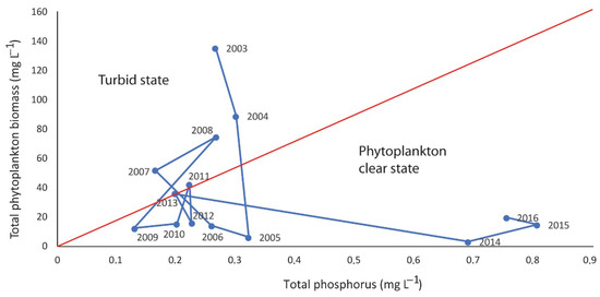 - Frenken, T.; Brandenburg, K.; Van de Waal, D. Long-Term Nutrient Load Reductions and Increasing Lake TN: TP Stoichiometry Decrease Phytoplankton Biomass and Diversity in a Large Shallow Lake. Limnol. Oceanogr. 2023, 68, 2389–2401. [Google Scholar] [CrossRef]