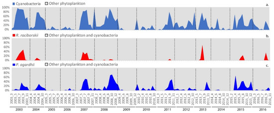 - Bonilla, S.; Aubriot, L.; Soares, M.C.S.; González-Piana, M.; Fabre, A.; Huszar, V.L.M.; Lürling, M.; Antoniades, D.; Padisák, J.; Kruk, C. What Drives the Distribution of the Bloom-Forming Cyanobacteria Planktothrix agardhii and Cylindrospermopsis raciborskii? FEMS Microbiol. Ecol. 2012, 79, 594–607. [Google Scholar] [CrossRef] [PubMed]