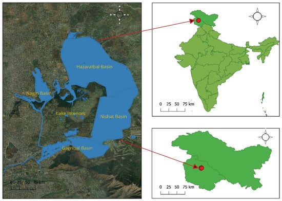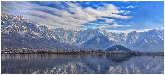 Dal Lake is a unique water body due to its natural features, ecological significance, and socio-economic importance, as well as its role in the development of the region and the well-being of its inhabitants. “The Jewel in the Crown of Kashmir” and “Srinagar’s Treasure” are the names given to Dal Lake. It is also the second largest lake in the state, located in the east of the city of Srinagar—the biggest city in the valley and the summer capital of the Indian-administered Jammu and Kashmir in the disputed Kashmir region (Figure 1 and Figure 2). Dal is a freshwater urban lake, and the most visited place in Srinagar by tourists and locals, but it is threatened by excessive anthropogenic activity [1]. The aim of the research was the evaluation of the specificity of the course and spatio-temporal dynamics of Dal Lake’s eutrophication process on the base of the accurate assessment of its actual trophic state, that is necessary for further development of the lake management strategy. The research results will constitute the basis for developing the concept for the lake protection against further degradation as a result of eutrophication.