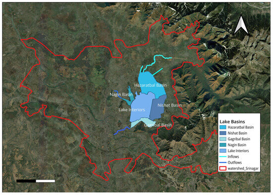 The five linked basins that comprise the major drainage system of the lake are the Nehru Park basin, the Nishat basin, the Hazratbal basin, the Nigeen basin, and the Barari Nambal basin. All these basins are connected by causeways. Dams divide the main lake from the lakes Nishat, Hazratbal, Nagin, Barari Nambad, and Nehru Park. Transportation connectivity to all five basins is provided via the navigation canals that connect the lakes (Figure 3) [5].