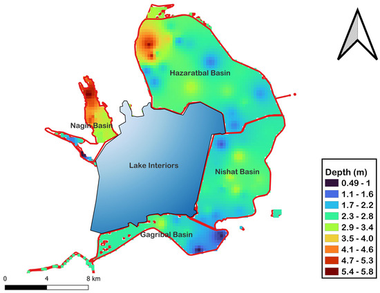 The depth of Dal Lake ranges from 6 to 2.5 m; the length is 7.44 km, and the width is 3.5 km. The bathymetric map for appropriate basins of Dal Lake is presented in Figure 4 [6].