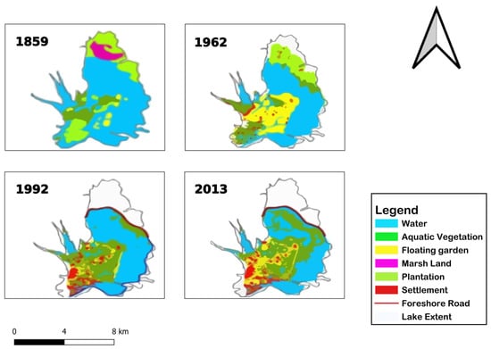 The evolution of the lake and the changes in the ways of developing the lake catchment area are shown at Figure 5, together with the dynamics of changes in the lake and wetland system surfaces and shoreline length changes, The expansion of lake interior, floating gardens, and the areas of aquatic vegetation development are also presented. The authors of the studies [7,8,9] stated the decrease up to almost 25% during 1962–2013 period of the lake surface during the 155-year period and significant degradation of the ecological state of the lake ecosystem (water surface decrease, eutrophication, deterioration of water quality, and reduction in biodiversity).