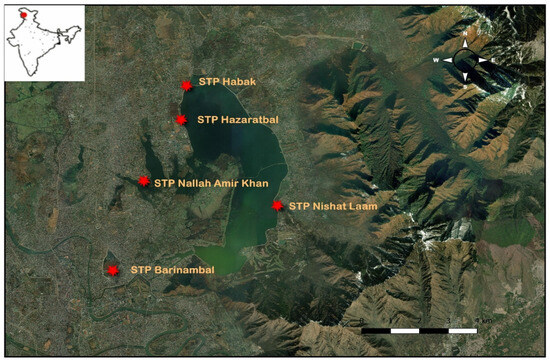 In addition to the intra-lake sources of pollution, there are also significant sources of pollution from the 5 million people living in the catchment area of the lake. There are also 15 major drains from Srinagar that carry sewage into the lake. According to the 2020 report of the J&K Pollution Control Board, Srinagar City generates 201,000 m3 of sewage daily. However, only 53.800 m3 can be treated in activated sludge technology, in Fluidized Aerobic Bioreactors (FABs) or Sequential Batch Reactors (SBRs), considering the existing treatment facilities’ capacity [12]. Around 73% of untreated sewage is discharged into Dal Lake or the Jhelum River, flowing through Srinagar City [13]. The location of sewage treatment plants (STP) is shown in Figure 7.