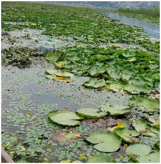 Another problem Dal Lake faces is siltation. About 40,000–50,000 tons of allochthone material, including the biogenic matter from the catchment area, are discharged into the lake through the Telbal and Maloori Nallahs [14]. It brings shallowing of the lake and the intensive development of water vegetation (Figure 8).