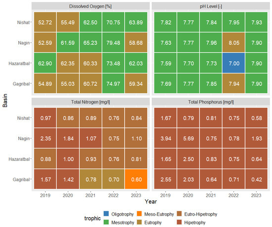 The comparison of the assessment results based on a set of four trophic indices, and those obtained on the basis of ITS, allows for the following conclusions: (1) the assessment obtained based on the content of nutrients gives very diverse results: TP characterizes the entire lake in the studied period as hypertrophic, the assessment based on TN indicates a tendency with different dynamics to lower the trophic state in the studied period in all basins, from hypertrophic to the borderline state of eutrophy, and in the Gagribal basin-to meso-eutrophy in 2022; (2) the assessment obtained on the basis of DO% indicates a fluctuation of conditions from mesotrophic to eutrophic; (3) the pH value indicates that mesotrophic conditions prevailed in the studied period, with the exception of 2022, when eutrophic conditions occurred in the Nigen and Gagribal basins, and oligotrophic conditions occurred in the Hazaratbal basin. These very diverse assessment results, based on a set of separate indicators, cannot be considered a reliable basis for drawing conclusions about the actual trophic state due to (1) the lack of limit values dedicated to the lakes of a similar type and (2) the lack of hydrobiological indicators, which are more informative for eutrophication assessment. All this leads to an unreliable assessment result that is not suitable for practical application.