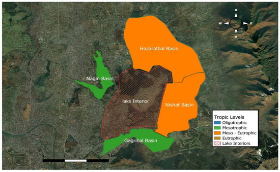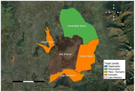 The obtained results of the assessment of trophic conditions in individual basins are presented in Figure 13, Figure 14, Figure 15, Figure 16 and Figure 17, and illustrate the temporal and spatial changes in the trophic state of Dal Lake in the studied period.