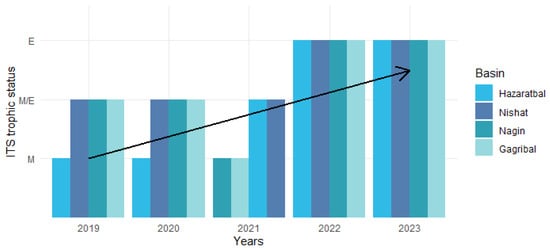 The results of analysis of the dynamics of eutrophication processes development in the five-year period studied are presented in Figure 18. The figure shows a very clear, disturbing trend of a constant increase in the trophic state, both in individual basins and in the entire ecosystem of the lake. It should be noted that in 2019, the Hazaratbal basin was characterized by the lowest mesotrophic state, which is considered optimal for the existence and breeding of fish in natural conditions. The remaining lake basins were on the border between mesotrophy and eutrophy. Over the years, the trophic state gradually increased in all lake basins, and increasingly exceeded the border of the meso-eutrophic state, reaching an advanced eutrophic state at the end of the research period, with the risk of transitioning to the hypertrophic level. One exception was the decrease in the ITS value in the Nishat basin in 2020, which, however, did not result in a change in its trophic state, but only a decrease in ITS value within boundary values for the meso-eutrophic state. Determining the exact cause of the temporary decrease in the ITS value could be due to a number of factors, such as weather conditions (e.g., temperature, precipitation, wind activity, measurement error, etc.), which would require detailed studies; this was not the aim of this research phase.