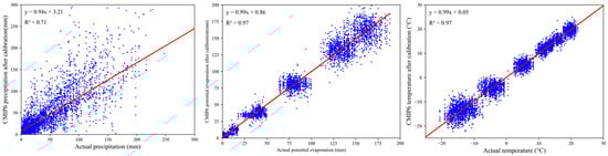 where m stands for month, and are the current status data and different month data, and are the mean data for different future months in CMIP6 mode, are the historical monthly average data in CMIP6 mode, and represent the bias-corrected data. The temperature correction was made using Equation (4), and the precipitation and potential evapotranspiration data correction was made using Equation (3). The corrected historical data were analyzed to obtain the mean value for the whole area. Then, they were compared with the current data to obtain the correlation analysis plot (Figure 3). The correlation coefficient between the corrected precipitation data and the current data stands at 0.71. The fitting equation, y = 0.94x + 3.21, indicates a robust fit with a relatively high correlation. This suggests a substantial improvement in precipitation data accuracy, and the corrected potential evapotranspiration and temperature data exhibit exceptional correlation with the current data, surpassing 0.97 in correlation coefficients and slopes. The appropriate equations, coupled with coefficients exceeding 0.97, signify a highly accurate fit. The discreteness of precipitation data is mainly evident during heavy rainfall events, which are relatively rare. However, the differences are smaller during periods of light precipitation. Due to the discretization of model space and time, temperature and potential evapotranspiration are discrete. These results underscore the effectiveness of the calibration process, providing enhanced reliability in potential evapotranspiration and temperature assessments.