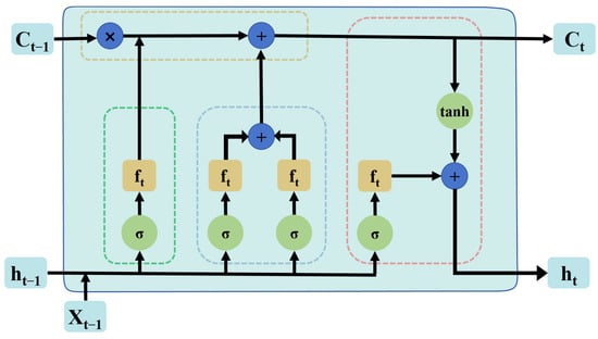 Long Short-Term Memory (LSTM) networks are recurrent neural networks that are frequently used for modeling sequential data, such as time series or natural language, due to their advantages with long-term dependencies, strong stackability and scalability, and capability to mitigate gradient vanishing [21]. The LSTM model is a recurrent neural network with three gate units in a memory block (Figure 4). These units are input gates, output gates, and forgetting gates. Under the RNN structure, the valves from each layer are added to the LSTM. Whether the memory state output result of the layer reaches the threshold or not, these valves are opened or closed, and the results are combined to calculate the current layer. Each valve uses the activation function to compute the memory state as input [43].