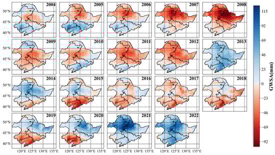 GWS data from GLDAS were analyzed from 2004 to 2022. The annual average GWS data obtained for each raster point were plotted at a distance to produce a spatial distribution of annual GWS changes in the northeast from 2004 to 2022 (Figure 5). The GWS of northeast China is divided, with 2013 as the cut-off time point. The northern region has experienced deficits for 13 consecutive years, with the largest deficit being more than 60 mm in 2008, influenced by the 2007 and 2008 droughts. The worst deficits were mainly located in the central part of the northeast China, with less fluctuation in the southern part. In 2013, the first peak in the GWS was caused by precipitation. In the following years, the GWS gradually increased in the northern region, especially in the central part of the northeast. The southern region was affected by drought and continued to experience a deficit, which reached its maximum in 2015. This deficit state gradually spread to the northern region until abundant precipitation in 2021 alleviated it in the northeast. The effects of drought in the northern region continued until 2021, when the GWS was replenished by abundant precipitation in the northeast, and a second peak occurred.