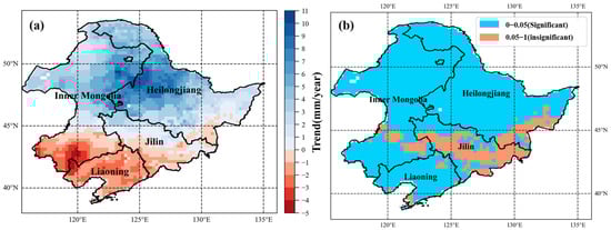 Spatial trend of the GWS in northeast China, 2003.02–2022.12. (a) The spatial trend of the GWS in northeast China, (b) spatial distribution of p-value corresponding to the trend.