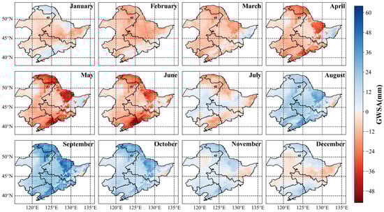 Spatial distribution of monthly-scale groundwater storage anomaly (GWSA) in northeast China.