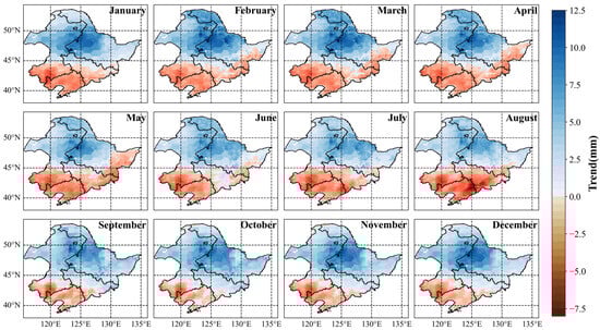 Spatial distributions of monthly trends in GWS in northeast China.