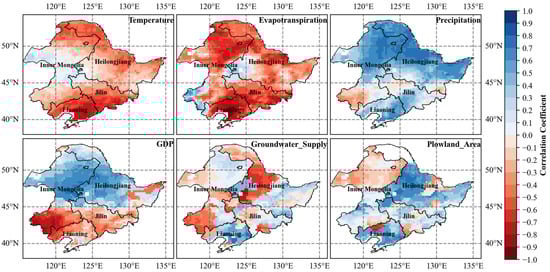 The correlations between the six driving factors and GWS were analyzed using Pearson’s correlation coefficients, as shown in Figure 9. Overall, climatic factors had a strong influence on the GWS (collection > 0.5) [44], with precipitation being dominant. The influence of socio–economic factors on the GWS was more difficult to analyze, and the influence of anthropogenic factors on the GWS varied in different regions. There were only a few regions where anthropogenic factors had a greater influence on the GWS, and those regions were primarily in the southwest of northeast China and the central part of Heilongjiang Province.