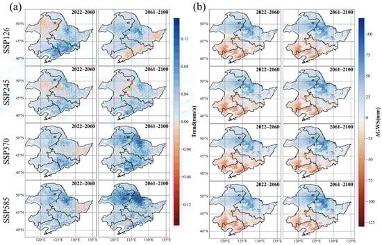 For the future time groundwater storage model, the future GWS tended to increase in all four scenarios from 2022 to 2100, with 0.08 ± 0.09 mm/a for SSP126, 0.11 ± 0.08 mm/a for SSP245, 0.12 ± 0.09 mm/a for SSP370, and 0.20 ± 0.07 mm/a for SSP585. Previous studies, like that of Döll et al. (2009), have explored the impacts of global climate change on long-term annual average diffuse groundwater recharge (GWR) from 2041 to 2070 using climate models ECHAM4 and HadCM3. These studies showed that GWR will increase in northeast China in 2041–2070, compared with 1961–1990. GWR in northeast China increased by 30–70%, compared with 1961–1990, showing an upward trend consistent with the conclusions of this paper.
