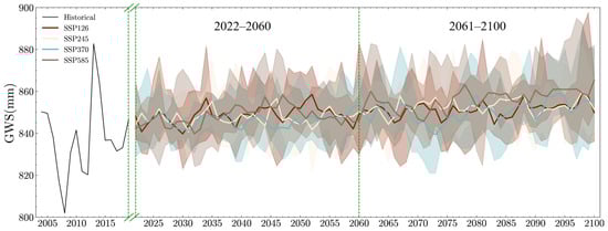 To conduct a more accurate analysis, the future GWS data obtained for the four scenarios of the seven institutional models are averaged in this paper and divided into the near term (2022–2060) and the far term (2061–2100) to be explored separately. The mean values were derived to obtain trend changes specific to the future period to obtain shared trend changes, and also to eliminate GWS changes at the extremes as a result.