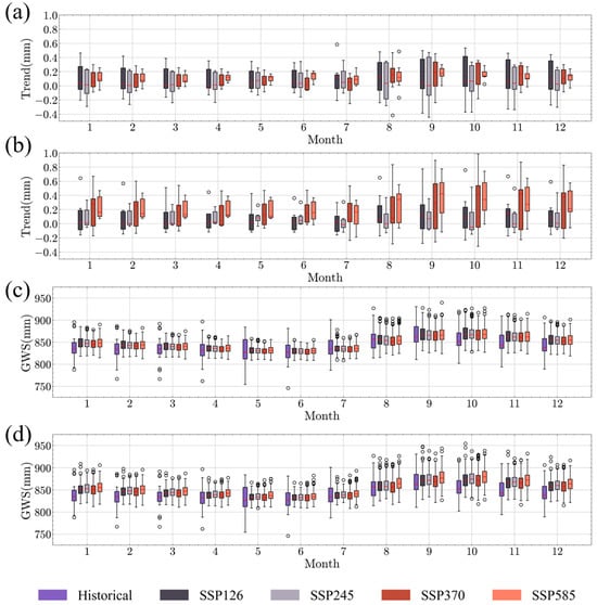 Box plots of monthly trends in mean values of future scenarios of groundwater storage in the northeast and changes in GWS. (a,b) Changes in inter-monthly trends for different periods. (c,d) Comparisons of inter-monthly mean values of GWS for different periods with historical GWS. (a,c) The period in 2022–2060; (b,d) the period in 2061–2100.