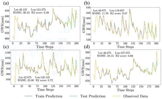 Fitted plots for the four sampled data points. In the figure, the yellow line represents the historical data, the blue line represents the prediction result of the training set, and the green line represents the prediction result of the testing set. (a,b) LSTM model; (c,d) Conv-LSTM model.