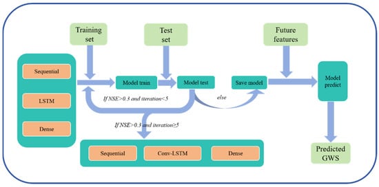 The LSTM (Long Short-Term Memory) model, unlike traditional methods such as the water balance equation, is a data-driven approach that is capable of capturing complex, non-linear relationships in time-series data. In this study, the LSTM model processes multiple input variables, including climatic and socio–economic factors, to predict groundwater storage (GWS). The model takes into account temporal dependencies in the data, which allows it to learn patterns and trends from historical observations. Specifically, the LSTM model is trained on past values of input variables to forecast future groundwater storage changes.
