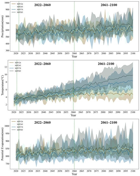 Figure 15 shows the future changes in annual average climate factors in northeast China that have been corrected by the Delta downscaling method. From the figure, one can see that the values of the modeled future climate factors differed significantly between the different GCMs. However, they exhibited the same upward trend on the time scale. Precipitation and potential evapotranspiration generally showed a fluctuating upward trend, while temperature showed a significant upward trend. This is consistent with the findings derived by other scholars [55]. The mean annual precipitation values for the three scenarios (low, medium, and high) were obtained under the six GCMs developed by Zhang et al. (2010) [56]. They ranged from 564 to 581 mm for the years 2030 to 2059, and from 593 to 637 mm for the years 2070 to 2099. These results are consistent with those from our study.