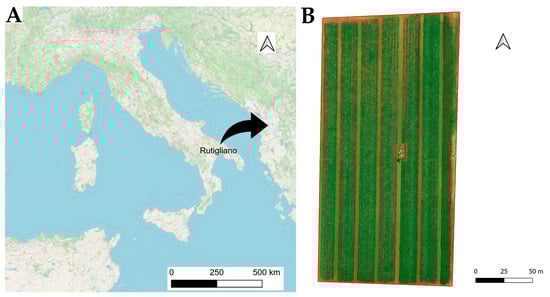 (A) Rutigliano, southern Italy (OpenStreetMap contributors); (B) aerial view of the experimental field where watermelon was cultivated in 2023.