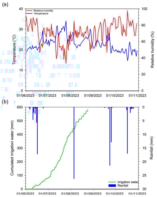 (a) Trend of mean temperature and relative humidity during the growing season; (b) daily rainfall and irrigation water applied during the growing season.