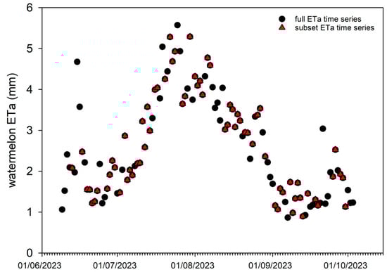 Comparison between the complete set of daily watermelon actual evapotranspiration data collected throughout the study season by eddy covariance method (black circles) and the subset corresponding to dates with available satellite imagery used in the analyses (red triangles).