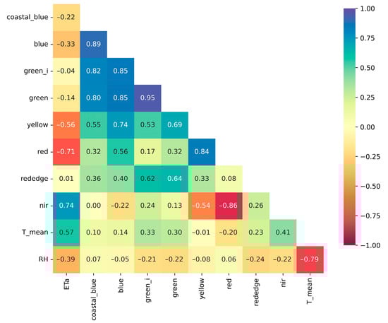 Figure 4 shows the correlation matrix of the variables included in the analyses. The nir spectral band had the strongest positive correlation with ETa (r = 0.74), and the daily average temperature had a positive correlation (r = 0.57) as well. Other variables showed negative correlations with ETa, e.g., red and yellow spectral bands (r = −0.71 and r = −0.56, respectively). Coastal blue, blue, green, and green_I spectral bands were highly correlated with each other (r > 0.80). For instance, the correlation between coastal blue and blue was 0.89, and between green_I and green it was 0.95, suggesting multicollinearity between the predicting variables. Nir and red spectral bands showed a negative correlation (r = −0.86). Daily average temperature and daily RH also had a negative correlation (r = −0.79). In the Supplementary Materials (Table S1), we report the descriptive statistics of the variables included in the analyses.