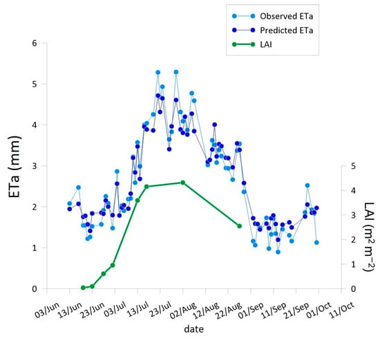 The best performing model has been applied to model the daily trend of watermelon ETa. Predicted and observed ETa mean values have been compared through Student’s t-test with a significance level set at α = 0.05.