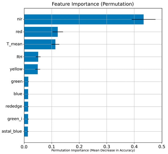 Permutation-based feature importance for the Random Forest model predicting watermelon actual evapotranspiration. Error bars indicate the standard deviation of feature importance across permutations.