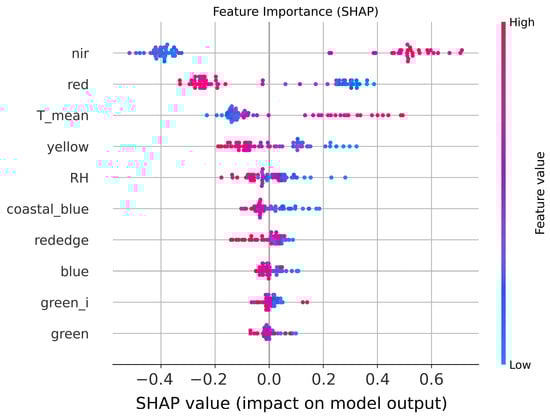 In this study, the application of the RF algorithm to predict daily ETa in watermelon using Planet satellite imagery and meteorological information achieved the best result among the compared models. The performance of these models varies significantly, reflecting their methodological differences and suitability for modeling complex environmental processes [63]. The RF algorithm’s capacity to handle multicollinearity among predictors is another significant advantage [64]; in our dataset, different spectral bands exhibited high correlations, which can be a challenge for multicollinearity-sensitive algorithms. RF addresses this problem by selecting random subsets of features during the construction of each tree, thus reducing the dominance of highly correlated variables and improving the robustness of the model [65,66]. These findings support the use of integrating machine learning techniques with remote sensing data for accurate estimation of ETa in horticultural crops (see, for example, the review by Ferreira et al. [67]). Interpretability is a key aspect of machine learning applications in environmental and agricultural sciences [68]. The permutation importance analysis found that the Nir spectral band was the most influential predictor, causing a significant decrease in model accuracy when permuted. This result is in line with the known sensitivity of the Nir band to vegetation biomass and water content, which are directly related to ETa [69,70,71]. The SHAP analysis provided a detailed overview of how each predictor impacted the model results. High values of Nir reflectance contributed positively to ETa predictions; on the contrary, higher reflectance values in the red band negatively affected ETa predictions, probably indicating areas of reduced chlorophyll content or plant stress, resulting in lower transpiration rates [72,73]. A high average daily temperature also had a positive effect on ETa, consistent with the physical processes that regulate evapotranspiration, where higher temperatures increase the vapor pressure deficit and drive transpiration [74]. Yellow band reflectance also negatively affected ETa predictions. High yellow band reflectance may be associated with some stress conditions or senescence of vegetation, resulting in reduced chlorophyll content and altered leaf pigment composition [75]. This may result in reduced photosynthetic activity and transpiration rates. SHAP values indicate that higher values of yellow reflectance contribute to lower ETa predictions, consistent with this physiological understanding. Relative humidity showed a negative relationship with ETa in the RF model. Higher RH values corresponded to lower predicted ETa, as indicated by the negative SHAP values. This inverse relationship is physically explicit, as high humidity levels reduce the vapor pressure deficit between the leaf surfaces and the phyllosphere, thus decreasing the transpiration rate [76]. SHAP analysis confirmed that days with lower RH contributed positively to ETa predictions.