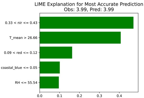 The analysis of the feature importance, SHAP, and PDPs of the RF model provided insights into the contributions and impacts of the individual predictors in the prediction of the ETa of watermelon. According to the permutation-based features’ importance, the Nir spectral band was the most important, with an average decrease in accuracy close to 0.4 when permuted. The red spectral band, daily average temperature, and yellow spectral band followed in importance (Figure 6). The SHAP summary graph quantifies the direction and magnitude of each feature’s contribution to the model’s predictions. Nir had the highest SHAP values, confirming the results of feature importance. Higher Nir values consistently contributed positively to ETa, while lower values had a negative impact on the model output. The red band shows an inverse relationship, with higher reflectance values reducing ETa predictions. The daily average temperature contributed positively to the prediction, with higher temperatures associated with higher ETa values. RH had a predominantly negative impact, reducing the Eta-predicted value as humidity increased. In the SHAP plot, the yellow reflectance exhibits a negative impact on ETa predictions. Higher values of yellow reflectance are associated with lower SHAP values, indicating that increased yellow reflectance reduces the predicted ETa (Figure 7). The LIME analysis provides localized insights by focusing on the most accurate prediction, identifying specific feature ranges contributing to its accuracy. Nir reflectance values between 0.33 and 0.43 and average temperature values above 26.66 °C had the greatest importance in the accuracy of the RF model. Similarly, the red, coastal blue and RH features showed positive but smaller contributions (Figure 8). PDPs provide insight into how each variable influences the expected ETa values while holding the other variables constant. The plot for the Nir spectral band shows a strong increase in ETa when Nir reflectance increases above 0.35. In contrast, the red spectral band reflectance shows an inverse relationship, with a strong decrease in ETa when the red reflectance rises above 0.11. The daily average temperature had a positive and almost linear relationship with ETa, particularly above 26 °C. As for RH, the graph shows a gradual decrease in ETa as relative humidity increases. The other spectral bands, such as coastal blue, green, and blue, show flatter relationships with ETa, indicating their limited predictive power compared to the other predictors. In the Supplementary Materials, we report the PDPs illustrating the relationships between the predictors and watermelon actual evapotranspiration (Figure S3).