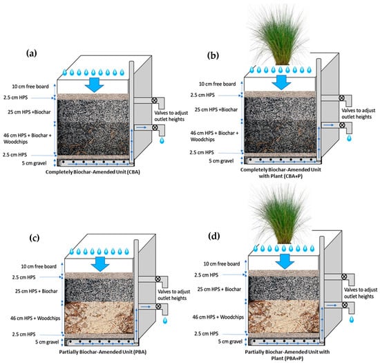 Schematic diagrams for the (a) completely biochar-amended (CBA) unit, (b) completely biochar-amended unit with plants (CBA + P), (c) partially biochar-amended (PBA) unit, and (d) partially biochar-amended unit with plants (PBA + P).