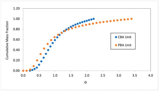 Cumulative tracer mass fraction exported vs. Θ for bioretention systems configured at their lower outlets.