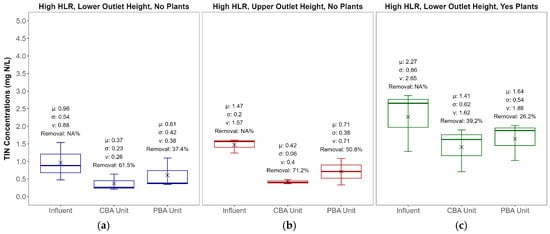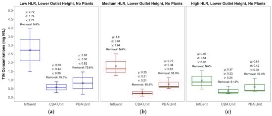 Box and whisker plots comparing effluent TIN concentrations for CBA and PBA units across varying HLR: (a) low, (b) medium, and (c) high.