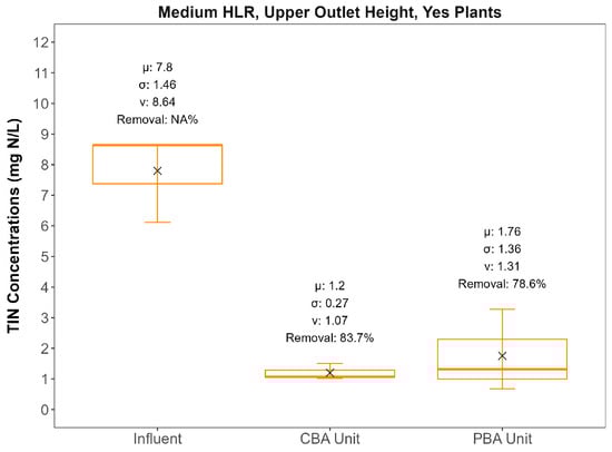 Average flow-weighted effluent concentrations and removal efficiencies (Table 2) show consistent TIN and NOx-N removal, as has been reported for other woodchip-amended bioretention system studies [49]. The box and whisker plots in Figure 3, Figure 4 and Figure 5 illustrate the distribution of influent and effluent concentrations for the CBA and PBA units. These plots compare different biochar-amendment strategies, outlet elevations, and plant presence, and they are annotated with the mean (μ), standard deviation (σ), median (ν), and % Load Reductions. On average, TIN removal rates were 12 g/m3-day for the CBA unit and 10 g/m3-day for the PBA unit, showing that biochar amendment in the IWSZ can significantly enhance nitrogen removal rates, most likely by increasing retention times, reducing short-circuiting, and supporting microbial activity (Table 2, p = 0.031). The presence of biochar in the IWSZ of the CBA unit also reduced effluent DO concentrations (see Figures S8 and S9) compared with the PBA unit (Figure S10), which further promotes denitrification. During some events, a slight increase in effluent NO2− concentrations was observed, indicating either partial nitrification (NH4+ → NO2−) or partial denitrification (NO3− → NO2−). Higher export of NH4+ during some events was likely due to ammonification of organic N. Alkalinity increased across all events for both units, consistent with denitrification. An increase in effluent COD was observed in 17% of events for the CBA unit and 72% for the PBA unit, possibly due to organic carbon leaching from woodchips.
