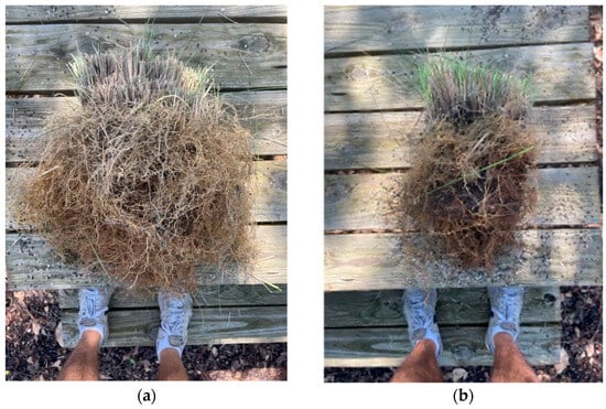 Image of roots of Muhly Grass from the (a) CBA unit (above-ground biomass = 0.73 kg) and (b) PBA unit (above-ground biomass = 0.23 kg). Shoes included for scale.