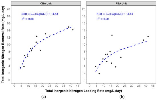 Logarithmic regression model for total inorganic nitrogen removal for the (a) CBA unit and (b) PBA unit.
