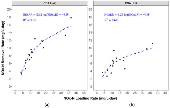 Logarithmic regression model for nitrate + nitrite (NOx) removal for the (a) CBA unit and (b) PBA unit.