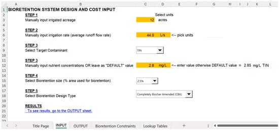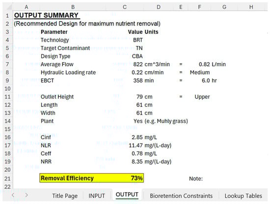 A spreadsheet-based tool was developed for preliminary design of a bioretention system tailored to treat runoffs from commercial nurseries with similar water quality characteristics as the demonstration site. The tool incorporates logarithmic regression models derived from this study. Default nutrient concentrations were derived from experimental averages in this study [40]. Using runoff volume and nutrient concentrations, the tool uses the model to estimate NLR and predicts NRR. Farmers can customize inputs such as bioretention system size and biochar inclusion to calculate the required surface area and nitrogen removal efficiency. This user-friendly spreadsheet tool streamlines nutrient management for irrigation runoff, providing a practical solution for improving water quality. Figure 9 and Figure 10 illustrate the tool’s input parameters and output results.