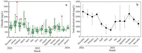 Temporal trends of (a) chloride and (b) total dissolved solids concentrations in RW. Boxes represent IQR at the RW outlet. Lines and white square within boxes represent mean and median values, respectively. The line plot represents daily changes in chloride concentrations at the RW inlet. Red dots indicate the 2nd/3rd and 17th/18th days of the lunar calendar. Error bars represent the maximum and minimum values.